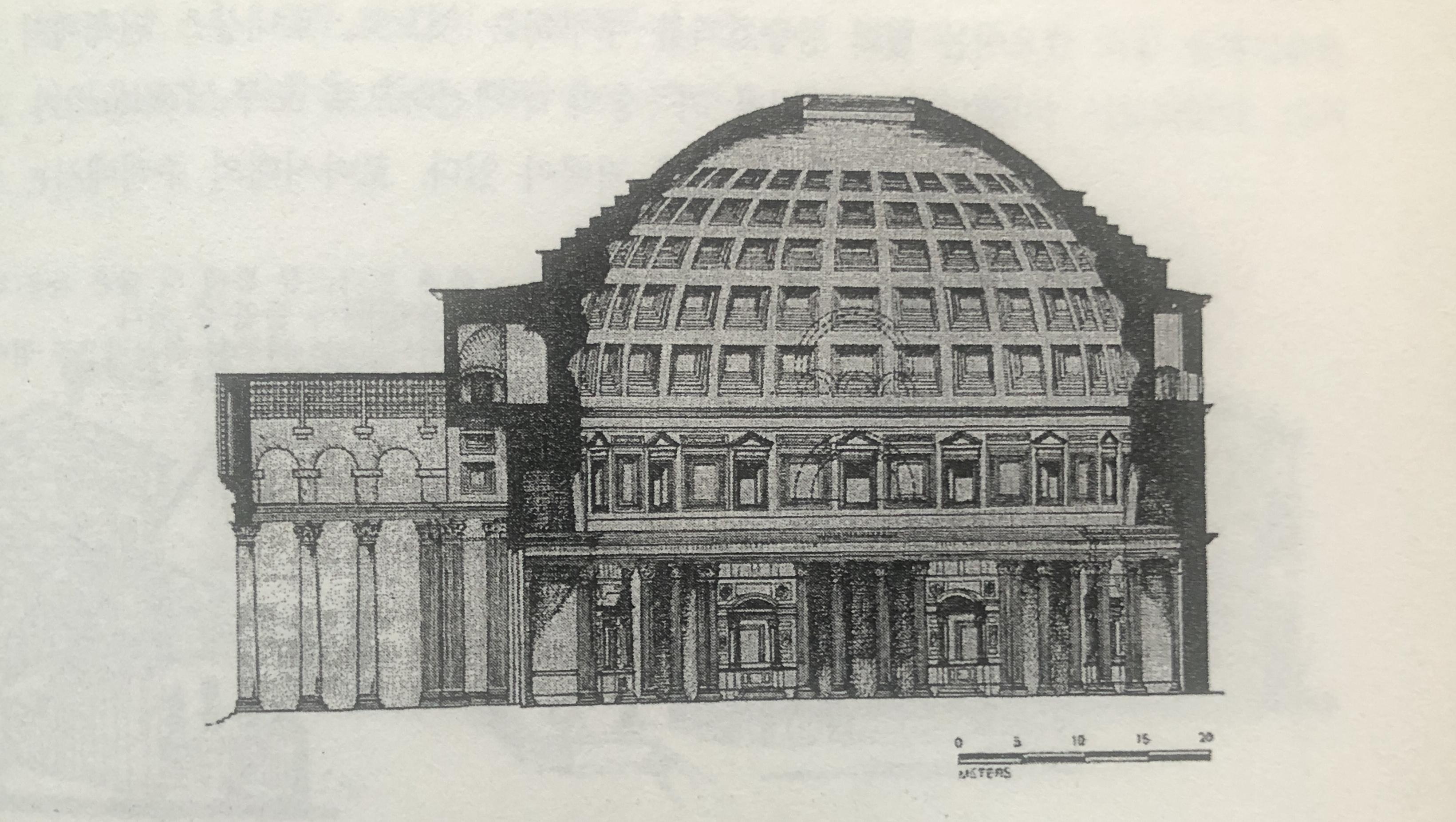 판테온 신전은 외관을 그리스 신전 건축으로 처리하고 있으나 상부의 로톤다(rotonda) 두고 그 중심부에 구멍을 뚫어 실내로 자연채광을 유입하고 있다로마시대 건축의 특징으로, 외부공간과 내부 공간의 단절을 극복하려는 노력을 시도하였다.