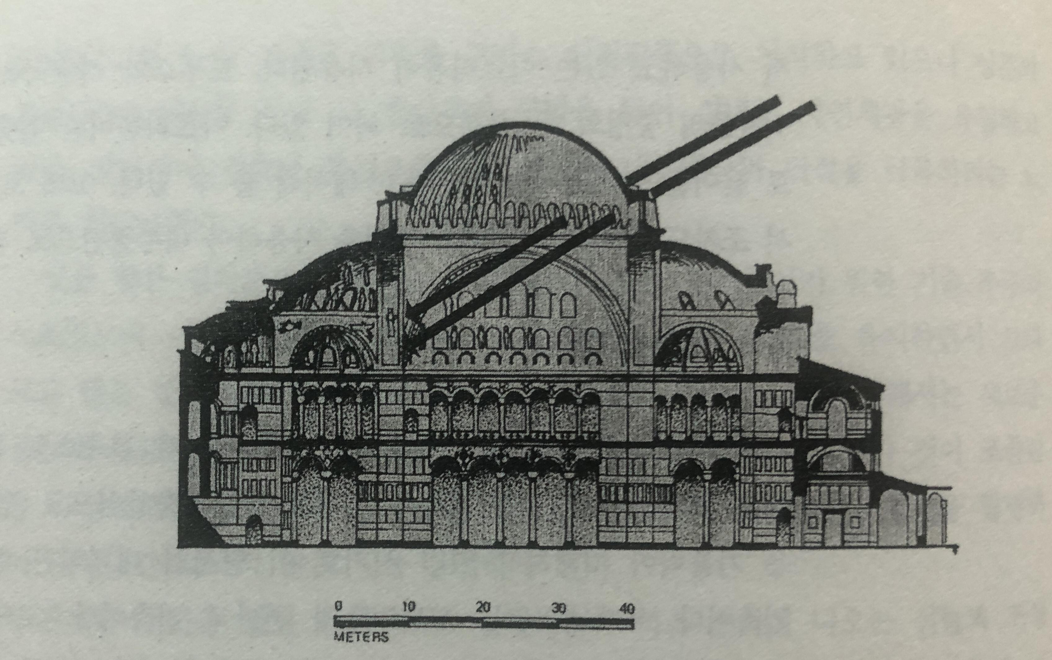 비잔틴 건축의 가장 두드러지는 특징은 사각형 평면을 덮기 위해 네 점을 지지하는 돔의 사용이다(로마시대에는 전체를 차지하는 돔이다). 이런 돔의 확장적 사용은 로마의 볼트와 초기 그리스도교 시기의 비교적 길고 좁은 평면을 덮기 위한 목재 트러스와 대조된다. 결과적으로 비잔틴의 평면은 주 돔 주위로 중심이 되고 주 돔 아래로 교차하는 반쪽 돔으로 덮힌 부차적 공간이 둘러싸여 있다. 빛은 돔 아래로 난 많고 작은 스테인드 글라스로 들어오면서 지지하는 구조물 위로 떠 있는 듯한 돔의 환영을 만들어 낸다.